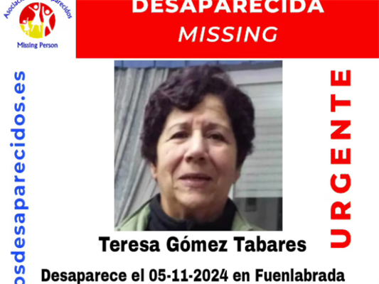La asociación SOS Desparecidos ha difundido una alerta por la desaparición en Fuenlabrada de Teresa Gómez Tabares. Aseguran que la mujer desapareció el pasado martes, 5 de noviembre.