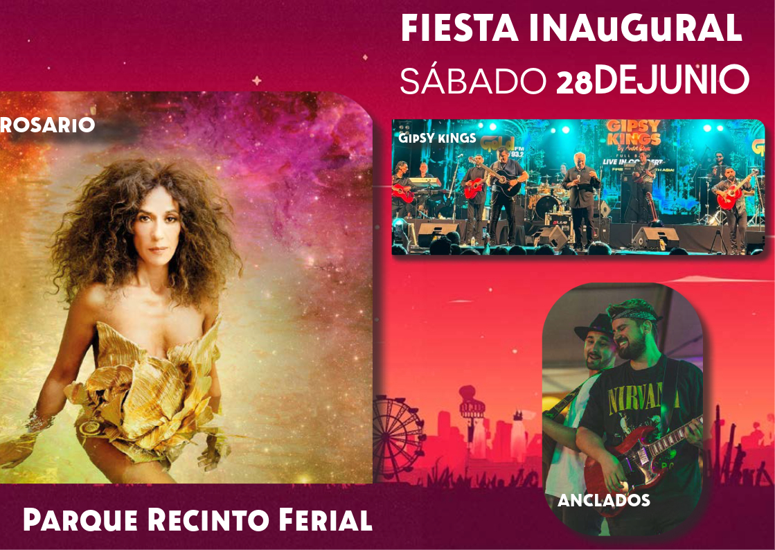 Rosario Flores y Gipsy Kings serán los platos fuertes del sábado con sendos conciertos que se iniciarán a las 21:00 y a las 23:30, respectivamente. A las 19 horas abrirá el Parque Ferial, a las 19:30 horas lo hará el auditorio con la actuación de los teloneros, el grupo local Anclados (20:20 h).