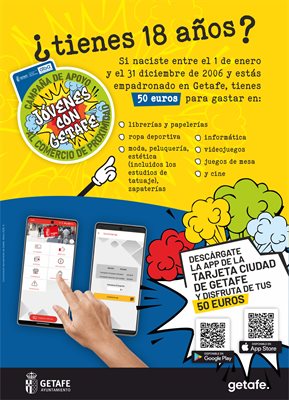 Conectar a los jóvenes con los comercios de proximidad para que los conozcan y disfruten de la calidad de su atención. Con ese objetivo el Ayuntamiento de Getafe repite por tercera edición las ayudas de 50 euros, que este año va dirigida a aquellos 2.113 vecinos que cumplieron 18 años en 2024, es decir, nacidos en 2006.