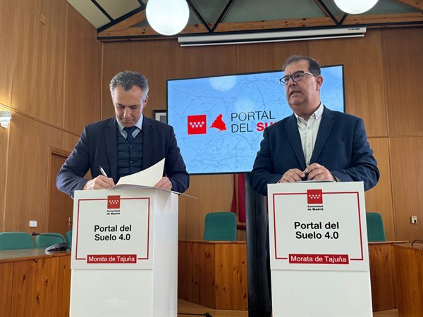 El consejero de Medio Ambiente, Agricultura e Interior de la Comunidad de Madrid, Carlos Novillo, y el alcalde de Morata de Tajuña, Fernando Villalaín, han suscrito, este viernes, el convenio de adhesión de la localidad al Portal del Suelo 4.0 con la incorporación de la parcela municipal ubicada en la calle José María Rodelgo, posicionándola como un espacio prioritario para la construcción de viviendas.